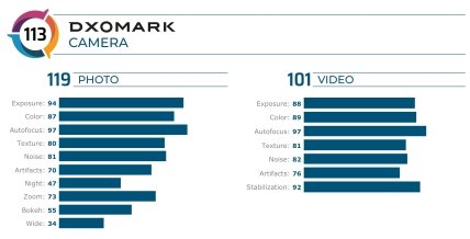 Фотовозможности смартфона оценили в 119 баллов, а видео — 101 балл.
