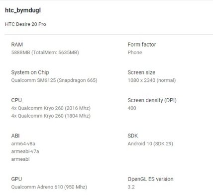 Новый смартфон Desire 20 Pro заметили в базе данных Google Play Console.