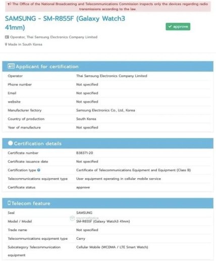 Новая модель прошла сертификацию регулятора из Тайланда NBTC. Она проходит под кодовым обозначением SM-R855F, но указано и коммерческое название часов - Galaxy Watch 3.