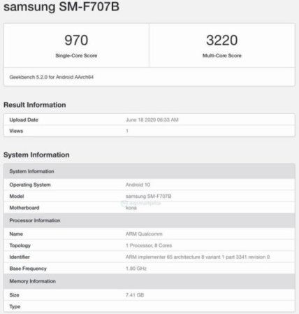 Новинку заметили в базе данных теста производительности Geekbench с номером модели SM-F707B. Аппарат, согласно утечке, работает на восьмиядерном процессоре Qualcomm с кодовым названием Kona. Оно соответствует флагманскому чипу Snapdragon 865. На это также намекают результаты теста. Для сравнения, обычная версия Galaxy Z Flip работает на прошлогоднем SoC Snapdragon 855+.