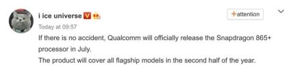 По словам китайского инсайдера Ice Universe, если всё пойдёт по плану, то Qualcomm Snapdragon 865 Plus дебютирует уже в следующем месяце. SoC будут устанавливать на все флагманские смартфоны, которые выйдут во второй половине этого года.