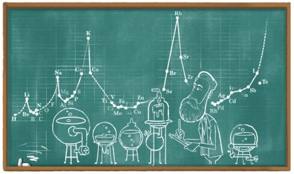 Doodle показывает ученого на фоне большой школьной доски с разными химическими элементами, построенными в график. Буквы из названия "Google" изображены в виде разных установок для проведения химических опытов.