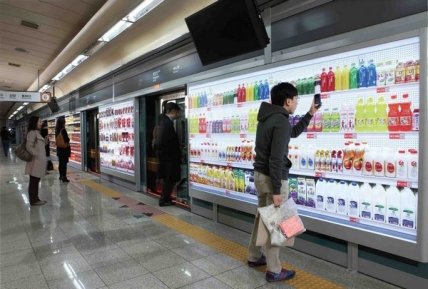 Корейская сеть супермаркетов Home Plus открыла свои «филиалы» на станциях Сеульского метрополитена. Каждый поезд этой подземки превратился в электронную витрину магазина. На ней помещены фотографии продуктов, цены на них и QR-коды, при помощи которых все это можно купить в виртуальном режиме. Заказ будет доставлен покупателю к моменту его прибытия домой.