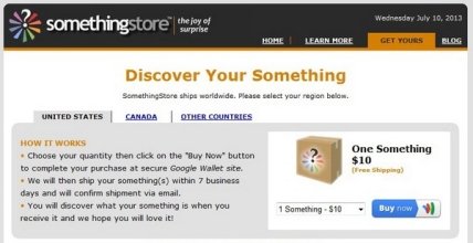 Онлайн-магазин SomethingStore предлагает вам купить за 10 долларов … случайный товар. В момент покупки вы не будете знать, что именно приобретаете – мобильный телефон, настольную игру, расческу или пустоту. И только после доставки товара домой, вы узнаете результат этой необычный лотереи.