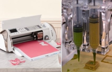 «Пищевые» 3D принтеры, сконструированные инженерами из NASA, печатают обеды для космонавтов. Специалисты компании Modern Meadows научили девайс производить мясо. Для получения мышечной ткани «картридж» просто заправили живыми клетками. Фирма Marta Stewart Crafts выпустила кондитерский принтерCricut Cake, «вырезающий» съедобные украшения для десертов.