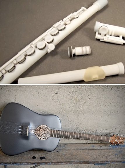 Дизайнер Скотт Самми (Scott Summi) создал первую в мире акустическую гитару, распечатанную на 3D принтере. С помощью этого гаджета сделан не только пластиковый корпус, но и металлические детали инструмента. По старинке изготовлены только деревянный гриф и струны гитары.Амит Зоран (Amit Zoran) из MIT Media Lab использовал ту же технологию для печати флейты.