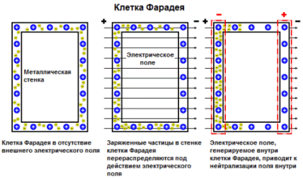 Он взял за основу свойство электропроводящих материалов проводить ток по образованному ими замкнутому контуру таким образом, что внутри электрическое поле нейтрализуется. Ток словно "стекает" по такой клетке, не проникая внутрь. Итак, даже если молния попадет в металлический кузов автомобиля, все находящиеся в нем будут в безопасности.