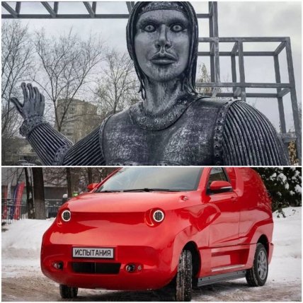 Также, по мнению соцсетей, новое чудо российского автопрома по красоте напоминает творение местных архитекторов. На фото — страшный памятник Аленушке, который простоял посреди провинциального городка "Новая Аленовка" в Воронежской области три дня. Затем его снесли.