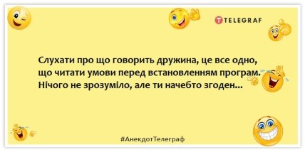 Через війну в Україні останнім часом весь український гумор побудований на військовій тематиці, однак ми пропонуємо вам на кілька хвилин повернутися у мирний час, та почитати гуморні анекдоти на "вічні теми". Раніше "Телеграф" склав підбірку анекдотів про блондинок, а тепер представляємо вашій увазі добірку жартів про стосунки чоловіка та дружини.