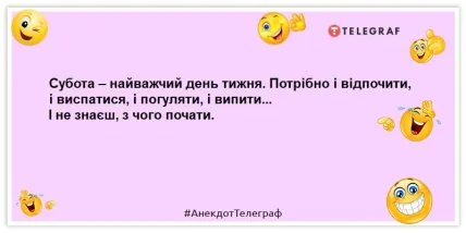 Щоб ви не сумували цієї липневої суботи, сьогодні "Телеграф" підготував порцію веселих жартів про вихідний день, які зроблять ваше проведення часу на нашому сайті незабутнім.