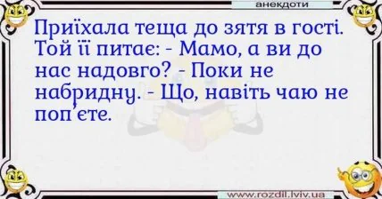 Теща — це по істині лотерея, ніколи не знаєш пощастить тобі чи ні, чи буде мама дружини "ангелом" або більше схожа на героїню популярних анекдотів. Щоб ви могли порівняти і зрозуміти яка мама дісталася вам, "Телеграф" зібрав найсмішніші та найприкольніші анекдоти про стосунки тещі та зятя.