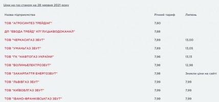 В цілому по Україні річна вартість газу не змінилася. В рамках тарифів на рік від газових компаній ціна варіюється від 7,8 до 13,5 грн за куб. Найвищі річні ціни на газ заявили в Чернівецькій, Житомирській та Херсонській обласних енергопостачальних компаніях.