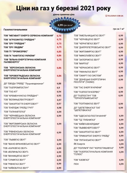 Так, у березні 2021 року найдешевший тариф становить 6,70 грн/куб. м. Одна з компаній-постачальниць почала березневий демпінг. Далі вже ціни зростають та три постачальниці виставляють вже 6,75 грн/куб. м по Україні. Решта компаній, які вирішили здешевшати блакитне пальне, вже наблизились до урядової відмітки. Одна пропонує ціну в 6,85 грн/куб. м. Три інших разом з "Нафтогазом" вже підіймають її на одну копійку. А ближче за все в інтервалі від 6,90 грн/куб. м до 6,98 грн/куб. м відмітилися 8 компаній.