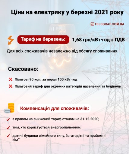 З 1 січня цього року пільги на електрику скасували. Тепер всі побутові споживачі платять виключно по 1,68 грн/кВт∙год з ПДВ незалежно від обсягу споживання.