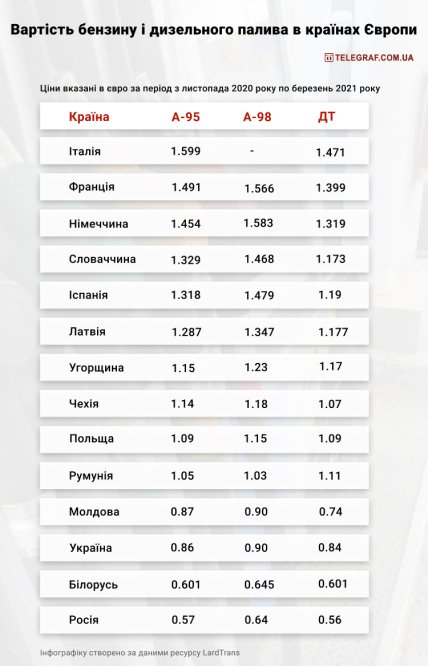 Вартість бензину і дизельного палива в країнах Європи