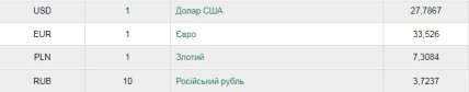 Долар США - 27,78 гривень (плюс 1 копійка);