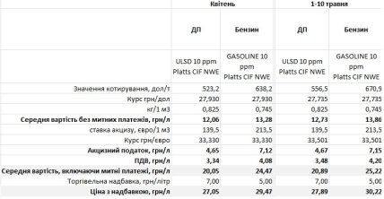 Середню вартість дизельного палива ULSD 10 ppm (Ultra-low-sulfur diesel - укр. Дизельне паливо з наднизьким вмістом сірки; 10 ppm - пропромілле - мільйонна частина концентрації речовини - авт) і бензину GASOLINE 10 ppm повинні рахувати на підставі даних Platts CIF NWE (джерело оцінки паливних базових цін на фізичних товарних ринках - авт.) за попередній календарний місяць або декаду.
