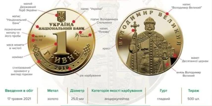 "Вона відтворює дизайн оборотної монети "Володимир Великий" номіналом 1 гривня зразка 2004 року, присвяченій видатному державному і політичному діячеві, автору середньовічної європейської держави Руси-України - князю Київському Володимиру Великому", - йдеться в повідомленні.