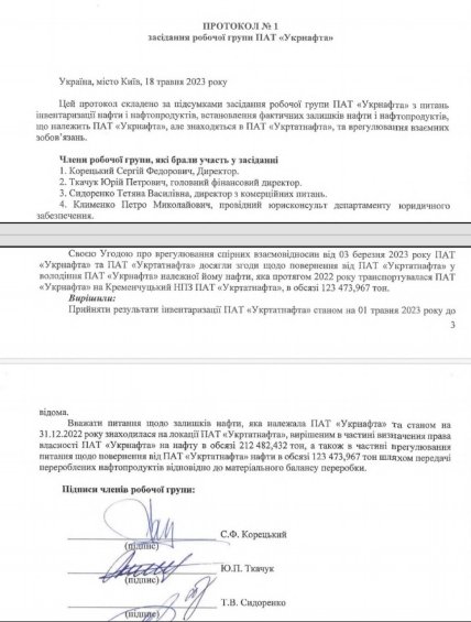 18.05.2023 Корецький, посилаючись на досягнуті "домовленості", спільно з іншими членами т.зв. "Робочої Групи" вирішив вважати питання щодо залишків нафти, яка належала "Укрнафті" та станом на 31.12.2022 знаходилася в "Укртатнафти", вирішеним.
