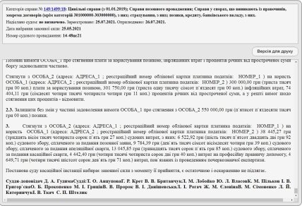 Судові баталії навколо позики та відсотків тривали понад три роки та дійшли до Верховного суду України. Останній своєю Постановою зобов’язав відповідача окрім 550 тисяч гривень основного боргу, виплатити й 300 тисяч гривень за користування позикою з 25 грудня 2014 року по 30 червня 2015 року.