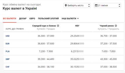 Український Нацбанк змінив офіційний курс долара і майже зрівняв його з вартістю на чорному ринку. З 21 липня курс гривні до долара США зріс на 25% — до 36,5686 грн/дол.