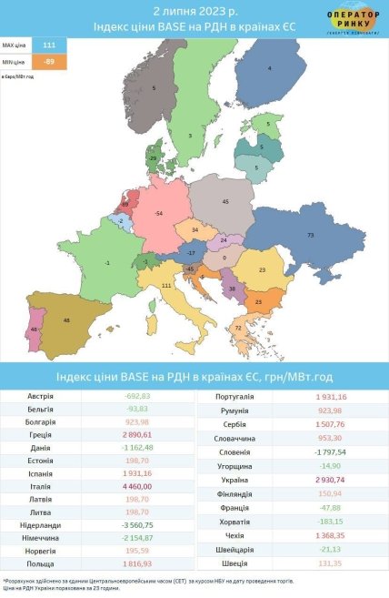 При цьому на інфографіці АТ "Оператор ринку" видно, що в Нідерландах ціна 1 МВт·год складає "мінус 3560 гривень", тобто продавці змушені доплачувати покупцям, аби лише позбутися зайвої електроенергії.