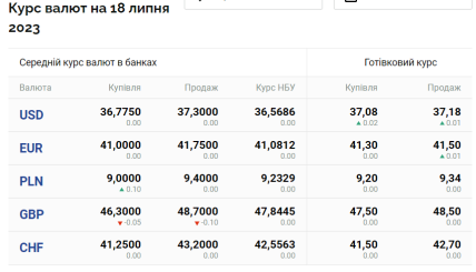 За даними "Мінфін", у вівторок, 18 липня, середній курс долара в українських банках становить 36,77 грн (купівля) та 37,30 (продаж). Готівковий курс — 37,08 (купівля) та 37,18 (продаж) грн. Водночас офіційний курс Національного банку України — 36,56 грн.