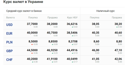 За даними порталу "Мінфін", у п'ятницю, 6 жовтня, середній курс долара в українських банках становить 37,70 грн (купівля) та 38,20 (продаж). Готівковий курс — 38,05 (купівля) та 38,20 (продаж). Водночас офіційний курс Національного банку України продовжує дорожчати — 36,62 грн.
