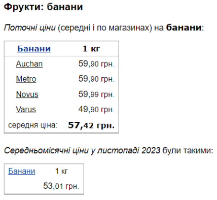 Банани у Varus продаються за найнижчою ціною — 49,90, в Auchan вартість тримається на рівні 59,90 гривні. Metro пропонує продукцію у вартості 59,90, а у Novus фрукт лежить на полиці з найвищим цінником — 59,99. Середня вартість цього товару у грудні складає 57,42 гривні.