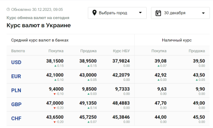 За даними порталу Мінфін, у суботу, 30 грудня, середній курс долара в українських банках становить 38,15 грн (купівля) та 38,95 (продаж). Готівковий курс — 39,08 (купівля) та 39,50 (продаж). Водночас офіційний курс Національного банку України — 37,98.