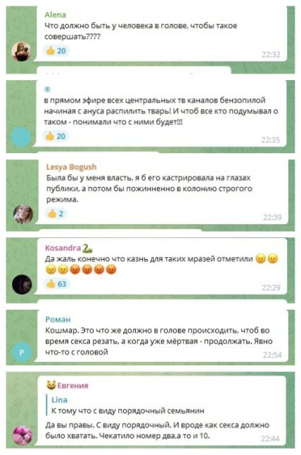 За їхньою інформацією, рани, яких на тілі жертви було 12, чоловік наносив під час сексу. Коли вона померла його це не зупинило — він продовжив згвалтування анально. Після – підпалив тіло. Фото з місця злочину можна подивитися строго 18+ за посиланням, вміст містить сцени жорстокості.