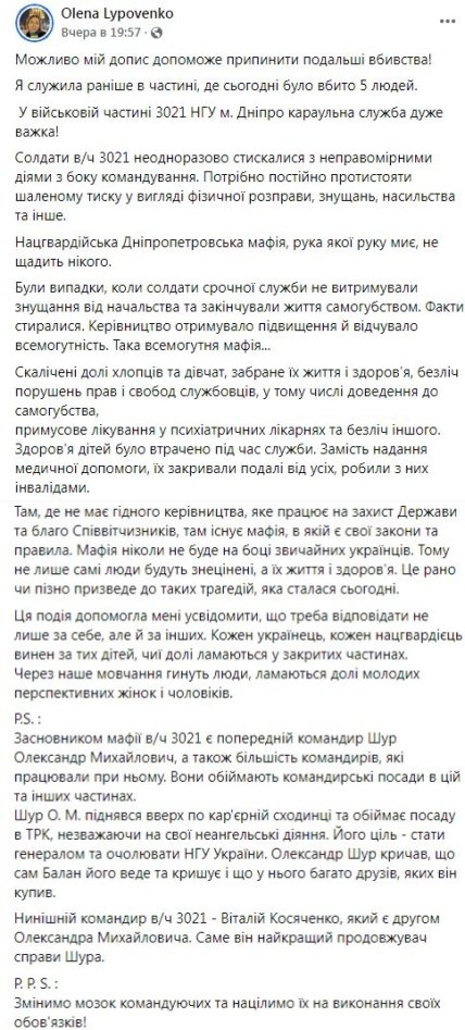 У своєму посту у Фейсбук вона також зазначила, що серед заходів, що застосовуються проти військовослужбовців, було і примусове лікування в психіатричних лікарнях і навіть траплялися епізоди доведення до самогубства.