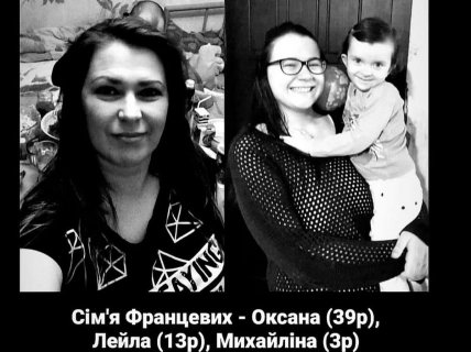 Також загинула 3-річна Михайлина Францева разом із 13-річною сестрою Лейлою та 39-річною мамою Оксаною, повідомляє "Наше місто". Родина мешкала на 5-му поверсі і в момент обстрілу знаходилася вдома. Чоловік Оксани та батько молодшої доньки Євген працює вчителем фізкультури та вцілів тільки тому, що його не було на той момент удома.
