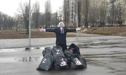 Чучело путіна встановили у сквері ім. Олександра Усачова. Його ноги оточують чорні пакети, що символізують загарбників, які загинули на території України. В останній день масляного тижня, який називається Проводи Масляної, за давньою традицією це опудало спалили.