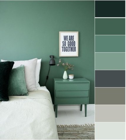 Виграшно виглядає насичений зелений на тлі нейтральних кольорів, зокрема сірого й білого. Ідеальним є поєднання його з природними тонами, особливо з відтінками коричневого.