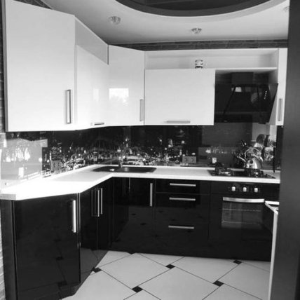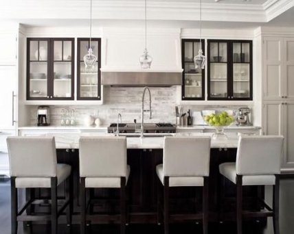 Кухня у чорно-білих тонах виглядає стильно та вишукано. Дзеркальні і скляні вставки в кухонних шафках – прекрасна ідея дизайнера, яка візуально полегшує сприйняття темного кольору меблів.