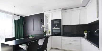 Кухня у чорно-білих тонах виглядає стильно та вишукано. Дзеркальні і скляні вставки в кухонних шафках – прекрасна ідея дизайнера, яка візуально полегшує сприйняття темного кольору меблів.