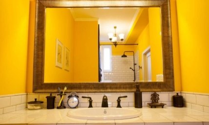 Дзеркало купила в Ikea. Спочатку рама була срібною, я перефарбувала її під зістарену бронзу. Всі баночки, гачки, тримачі і мильниці замовила на ebay. Там же знайшла змішувач і бра.
