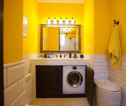 Під стільницею розмістилася пральна машинка і відділ для побутової хімії. Щоб під стільницю з виразний раковиною вдалося нормально вмістити пралку, зробили її досить високою (близько метра у висоту). Спочатку було незвично, але в підсумку можу сказати, що користуватися такою стільницею дуже зручно.