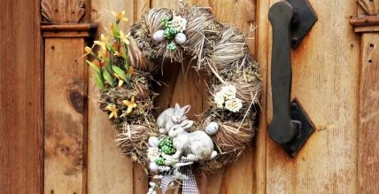 Зустрічайте гостей пасхальним привітанням ще на порозі, прикрасивши вхідні двері витонченими весняними вінками.