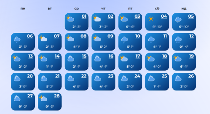 У січні температура опуститься не нижче -5 градусів, але синоптики прогнозують і більш теплі дні до +4 градусів. Сніг можна очікувати в середині місяця, а сонце — тільки в першій половині.