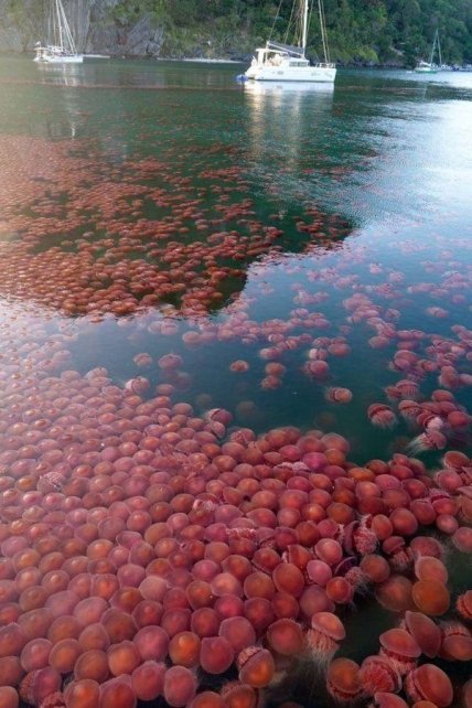 На півдні Філіппін прибережні води пляжів заполонили тисячі рожевих (томатних) медуз через відсутність туристів у зв'язку з коронавірусів і каранатіном.
