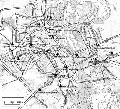 Схема розміщення стаціонарних постів спостереження в Києві: