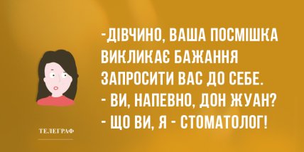 Пацієнтка: Але ж, пане докторе, вже десять хвилин тримаю виставлений язик, а ви на нього зовсім не дивитеся.