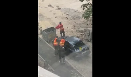 Не зовсім зрозуміло, через що почався конфлікт, однак оператор встиг зняти, як водій нападає зі спини на чорношкірого будівельника, а потім намагається сховатися в машині. Однак потерпілий з колегами довго тягнути з відповіддю не стали, заблокували машину, а потім дали здачі.