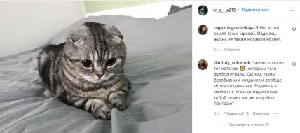 Не виключено, що кіт на відео належав 9-класниці. У всякому разі, на сторінці дівчини в Instagram є фото тварини, під яким користувачі мережі вже залишили свої побажання для жорстокої власниці. Додамо, що в описі профілю дівчинка написала: "Хіба той, хто любить, завдасть біль коханій людині".