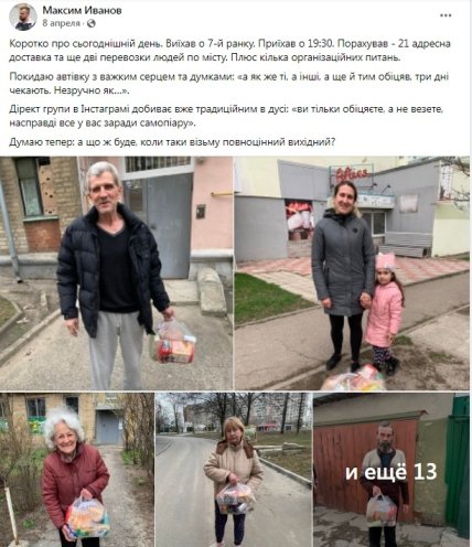 "Приїжджаємо на адресу і бачимо людину, яка, на перший погляд, сама могла щось зробити: купити чи вистояти в черзі за державною гуманітаркою на "Новій пошті". Дорослі здорові мужики, тітки, цілком бадьорі й необтяжені, судячи з усього, немовлятами", — перераховує Максим.