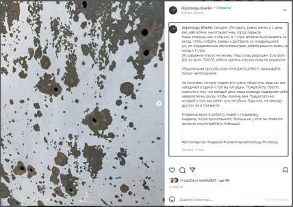"Якщо покататися містом, то дуже сильно впадають у вічі машини з табличками "Волонтери". Можна подумати, що їх дуже багато. Проте чи не кожна друга бабуся скаржиться, що тижнями чекає на гуманітарку і робить заявки до 4-5 організацій. Харків, мабуть, настільки величезний, і так багато людей залишилося, що навіть величезна кількість волонтерів не охоплює все місто", — зазначає волонтер.
