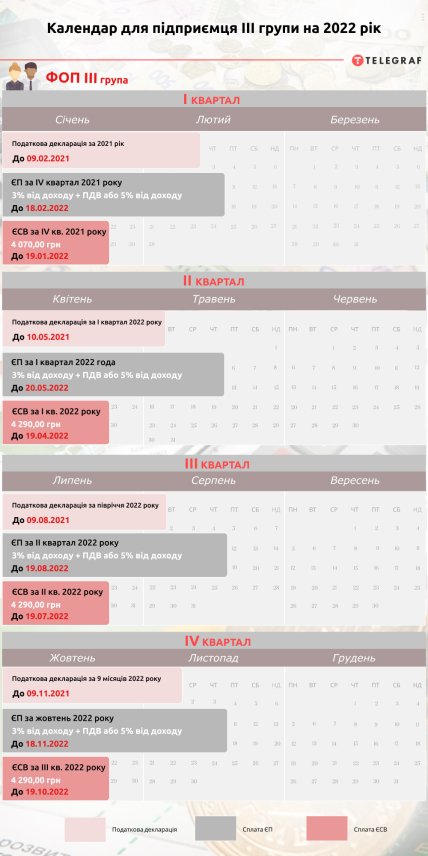 Щоб полегшити життя підприємців третьої групи, які обирають спрощену систему оподаткування, "Телеграф" підготував інфографіку з основними важливими цифрами та датами для звітності, а також податковий календар на 2022 рік.