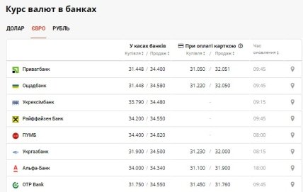 У банках курс долара орієнтується на офіційну, заморожену вартість, а євро дешевше, ніж на чорному ринку. У частини банків відрізняються вартості валют при готівковому та безготівковому обігу.